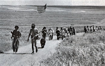 It was a difficult feat even now pulling the canoes and all the equipment up the hills and 18 miles over the prairie from the beginning of the portage at Belt Creek to the end at White Bear Island. It was hot and windy and the load was heavy. "Ben", who lives in the area of the Portage in Great Falls, Montana, took all this in his stride and enjoyed the companionship of the men walking, eating, sleeping and occasionally swimming with them. He also took part in the various ceremonies related to the expedition.